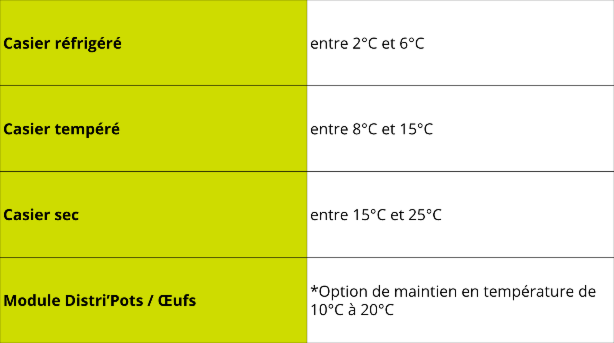 Côté conservation, plusieurs plages de température sont proposées selon les produits à distribuer :
