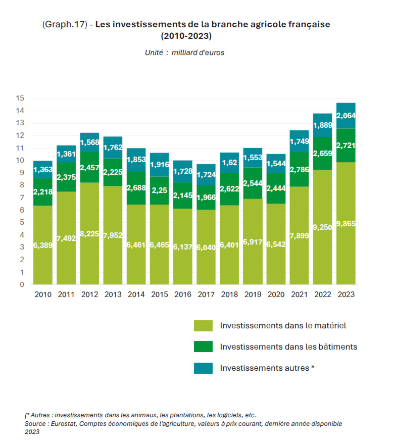 Mais 2024 a tout stoppé net. Les commandes ont commencé à baisser mi-2022 et les stocks se sont épuisés fin 2023. Les prix des machines ont grimpé de 26% entre 2020 et 2023 due à la hausse des coûts de l'énergie et des matières premières, soit 30% de plus qu'avant le Covid. Ainsi, les grandes cultures, la viticulture et la polyculture-élevage perdent 14% de ventes. Le chiffre d'affaires total tombe à 16 milliards d'euros, soit 15% de moins.