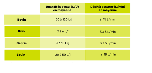 Chez les bovins, les vaches laitières et les jeunes bovins boivent de gros volumes en peu de temps, ce qui impose des abreuvoirs larges, rapidement accessibles et à haut débit. Ovins et caprins consomment moins mais en prises fréquentes, avec un risque de blocage des animaux dominés si les points d’eau sont trop peu nombreux ou mal répartis.