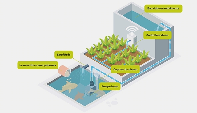 L'aquaponie est un système de production alimentaire qui combine l'aquaculture (l'élevage de poissons, de crustacés, ou d'autres organismes aquatiques) avec l'hydroponie (la culture de plantes sans sol). Dans un système aquaponique (système à recirculation, système à média filtrant, etc.), l'eau contenant les déjections des poissons, riche en ammonium, est transformée en nitrates par l'action de bactéries. Ces nitrates servent ensuite de nutriments pour les plantes. L’eau est pompée vers des systèmes de culture de plantes. Les plantes, à leur tour, filtrent et purifient cette eau, qui est ensuite réintroduite dans les bassins de poissons, créant ainsi un cycle écologique fermé. Cet écosystème est quasi autonome, l'unique intervention humaine nécessaire étant l'alimentation des poissons.