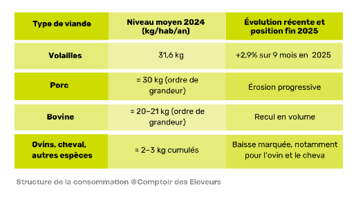 2. Quelles viandes dominent l’assiette fin 2025 ?
