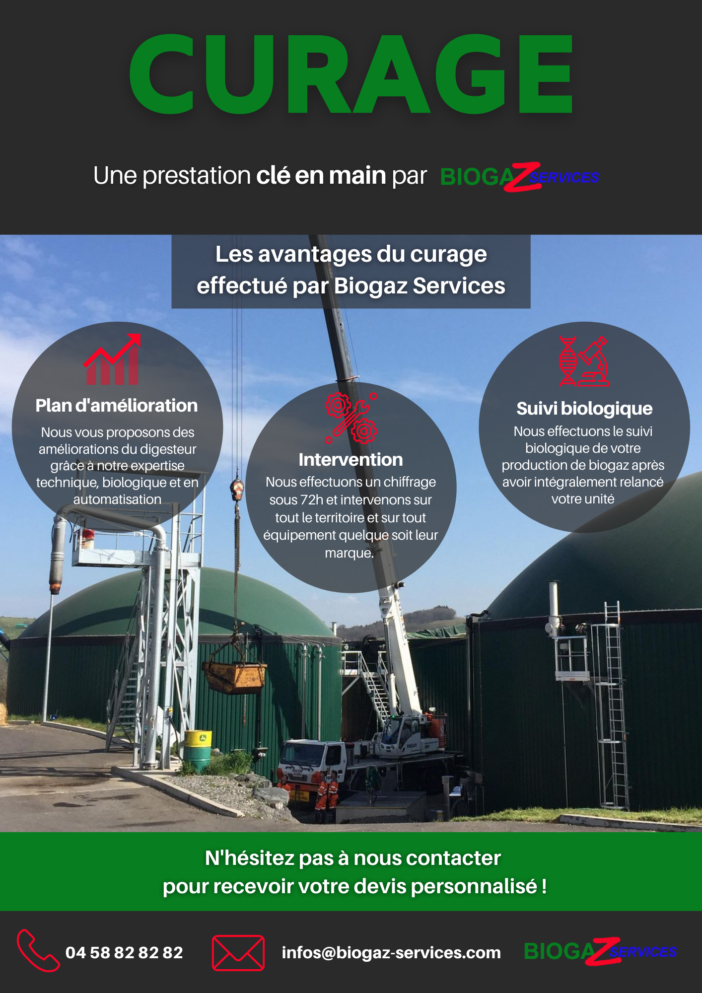 Chiffrage en 72h Intervention sur tout le territoire Propositions et conseils d'améliorations du digesteur Suivi biologique de votre production après curage
